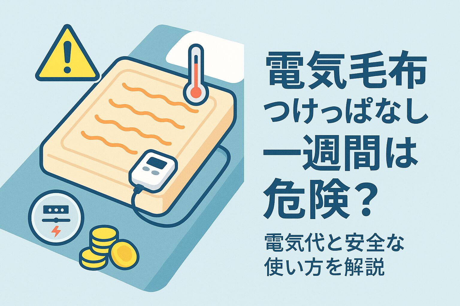 電気毛布を一週間つけっぱなしにするのは、火災や低温やけどのリスクが高く、電気代も増え、製品寿命を縮める恐れがあります。