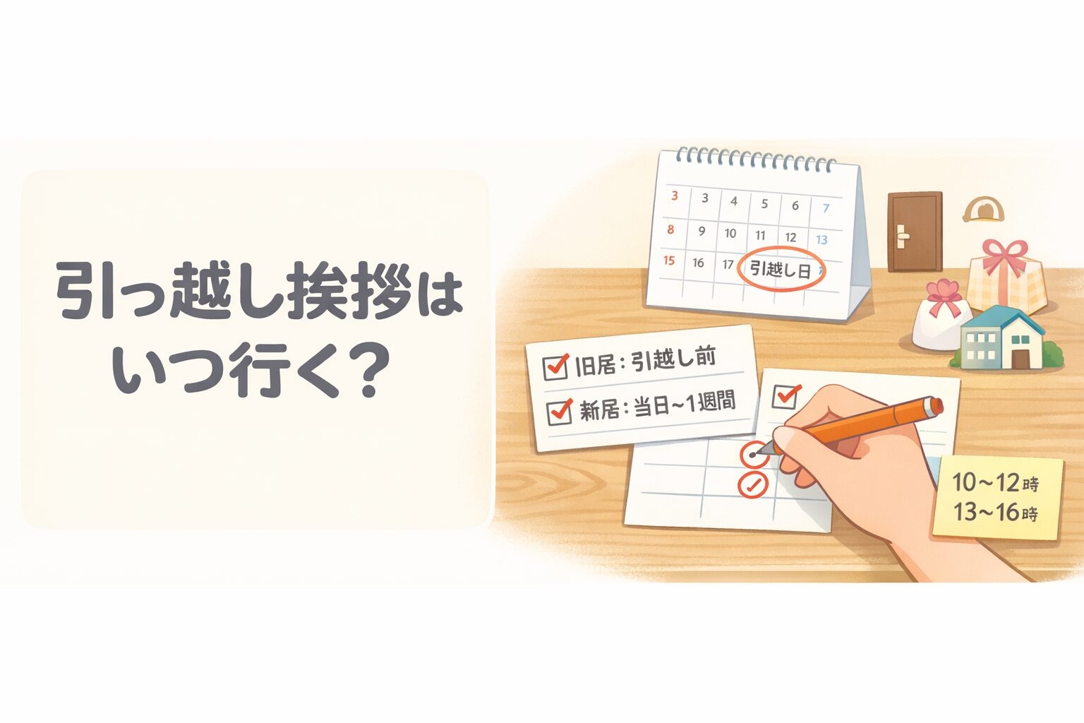 引っ越し挨拶はいつ行くのが正解か迷うのは、旧居と新居でタイミングが違い、当日が良いのか遅すぎないかが不安になるからです。