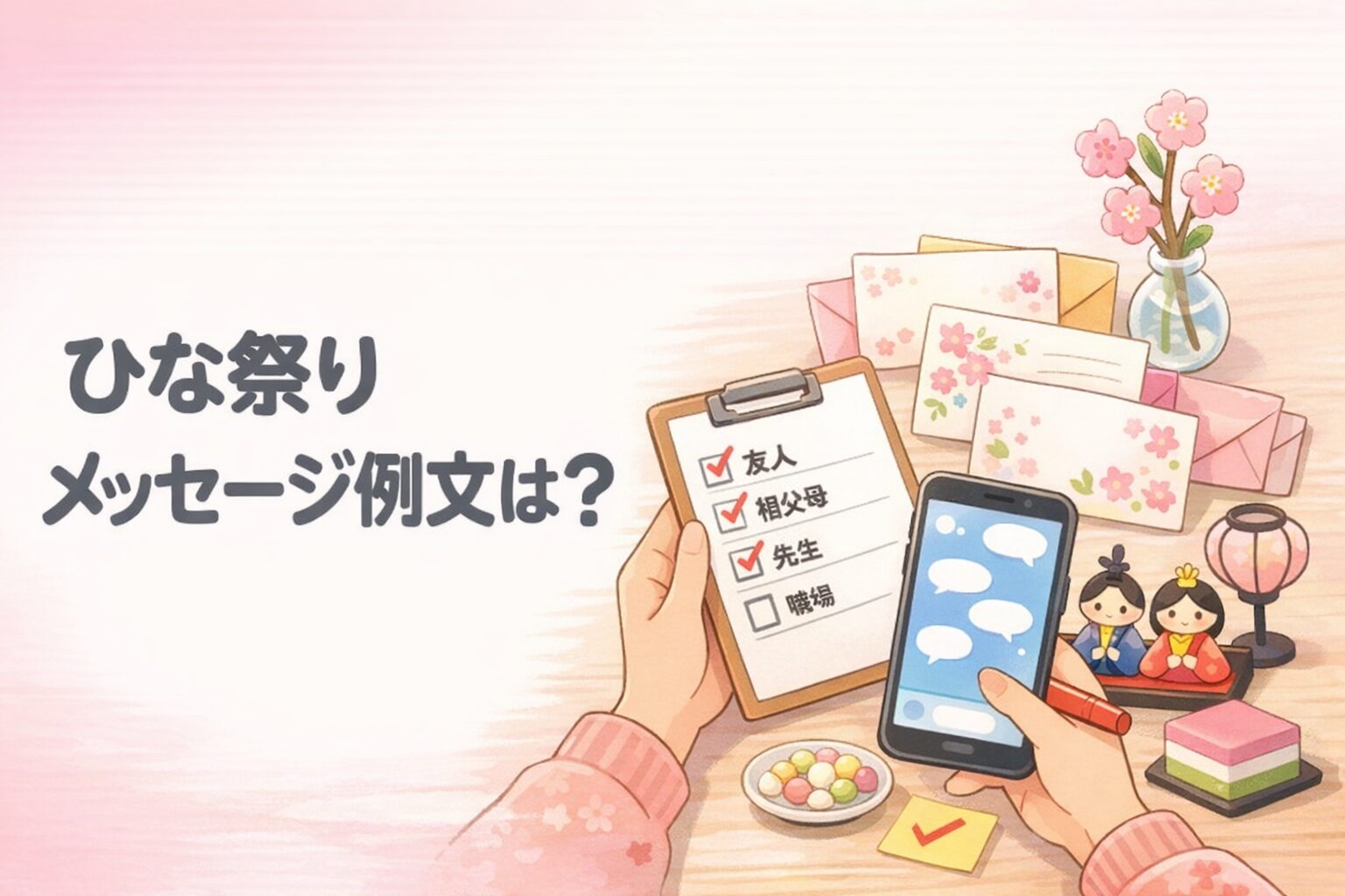 ひな祭りのメッセージ例文は、相手に合わせて「祝う+願う+気遣い」を選べば、短文でも丁寧文でも失礼なくまとまります。