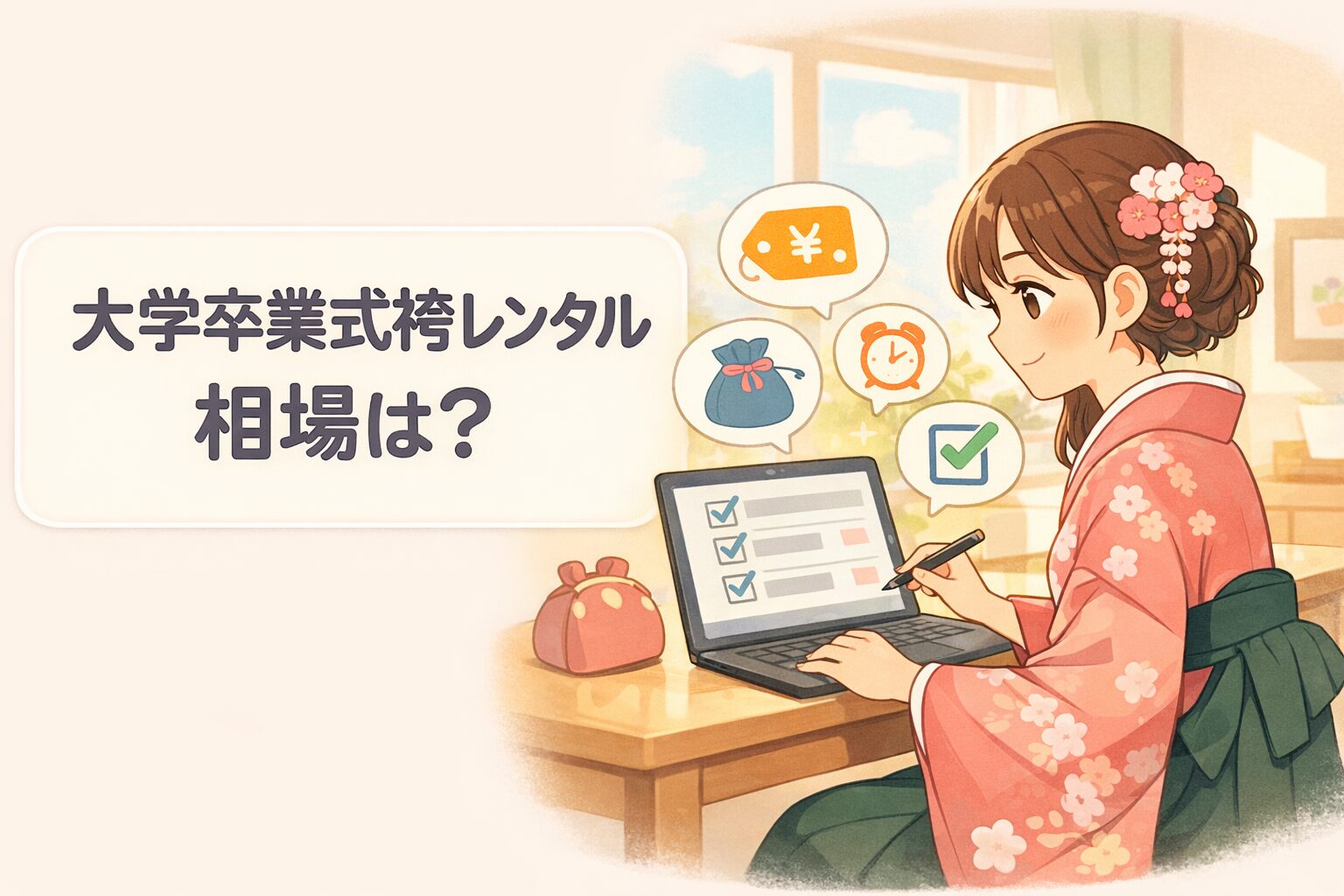 大学卒業式の袴レンタル相場の結論は、「衣装代+支度代+当日追加」で総額が決まることです。